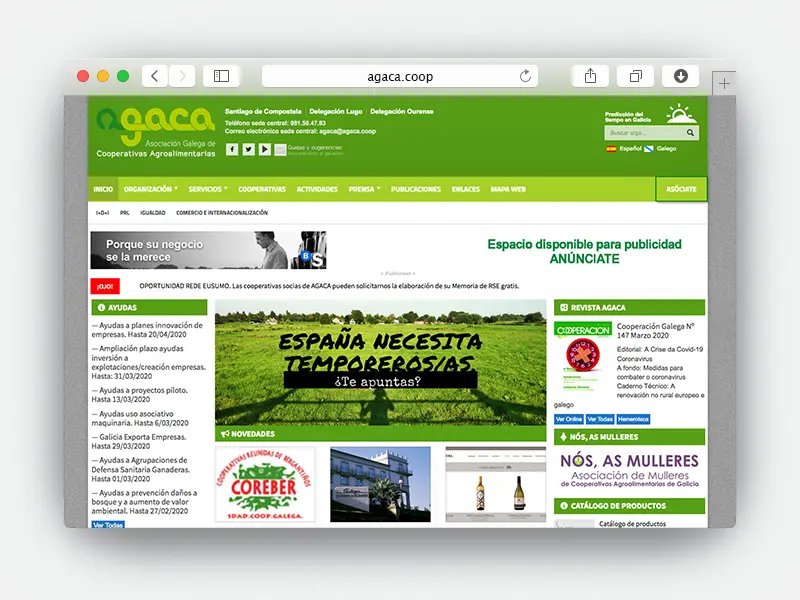 Asociación Gallega de Cooperativas Agrarias con sede en Santiago de Compostela. Necesitaban una web que fuese muy dinámica para subir noticias, cooperativas, revistas digitales, ayudas públicas, cursos, eventos etc. Fue una de nuestras soluciones más completas, con desarrollo a medida en Wordpress.