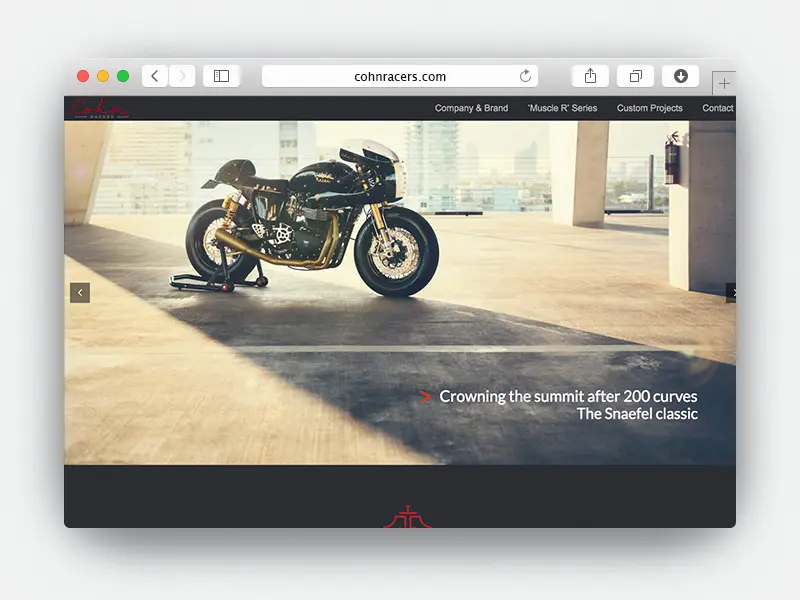 Conn Racers es una marca de personalización de motos con sede en Miami, Estados Unidos. Se puso especial énfasis en el diseño de la web. Además se programó un módulo especial para poder personalizar tu propia moto, pudiendo cambiar aspectos como el color de las llantas, manillar, chásis, etc.
