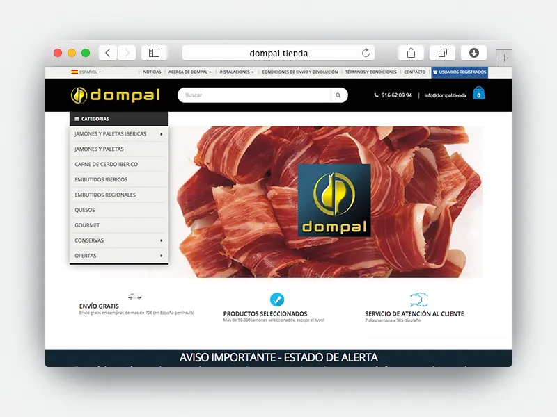 Dompal es productor de jamones y embutidos. Se le diseñó su tienda online, poniendo especial atención al posicionamiento SEO de la misma y en la actualidad se le gestionan diversas campañas SEM de publicidad.
