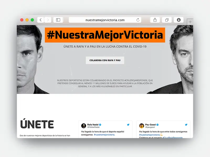 Nuestra Mejor Victoria es una landing page que pretende servir de ayuda para dar a conocer la estupenda iniciativa de Rafa Nadal y Pau Gasol para recaudar fondos para Cruz Roja con el objetivo de ayudar a los más necesitados por las consecuencias del COVID-19 en España